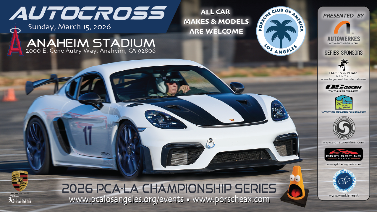 PCA Los Angeles invites you to come out and join us for the 3rd event in our monthly autocross series. Our series has been organized by volunteers with a long history of running POC and PCA sanctioned autocross events. Autocross is a fun way to learn the basic handling dynamics of your car in a controlled environment.